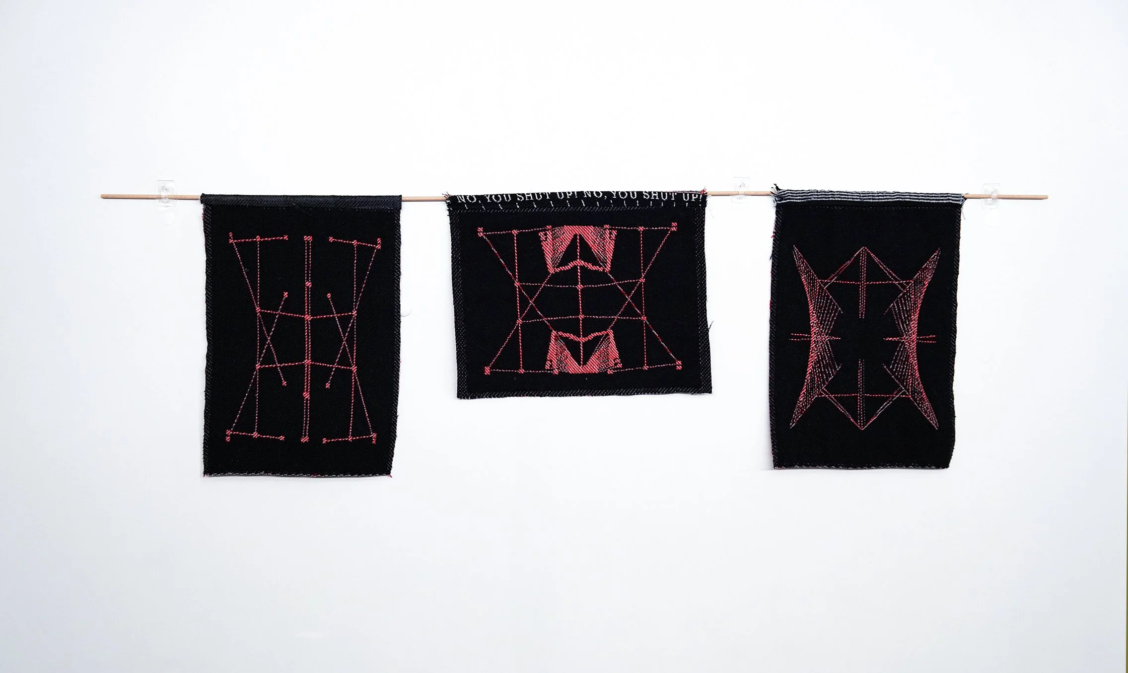 Shut Up! No, You Shut Up! (2025) collab with Dominique Ebert Jacquard weaving, sewing, wool & black velvet, 100cm x 60cm Exhibition view, Les Enfants Terribles, Gemuse Gallery, Hamburg, 2025